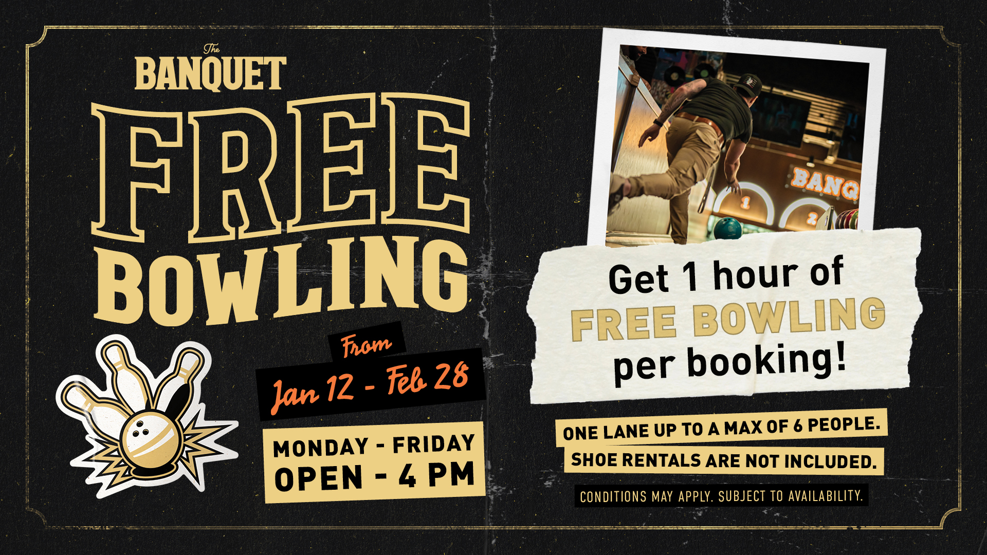 Enjoy Free Weekday Bowling Enjoy a complimentary hour of bowling at the Banquet during our special weekday promotion! Until February…